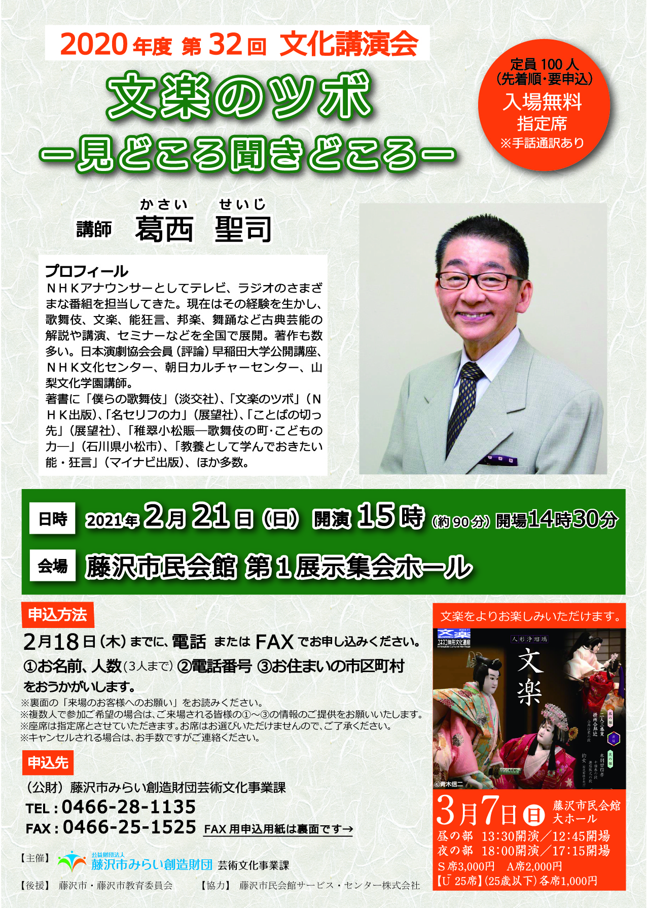 今年の文化講演会のテーマは葛西聖司氏による「文楽のツボ」です。たくさんのご応募お待ちしております。