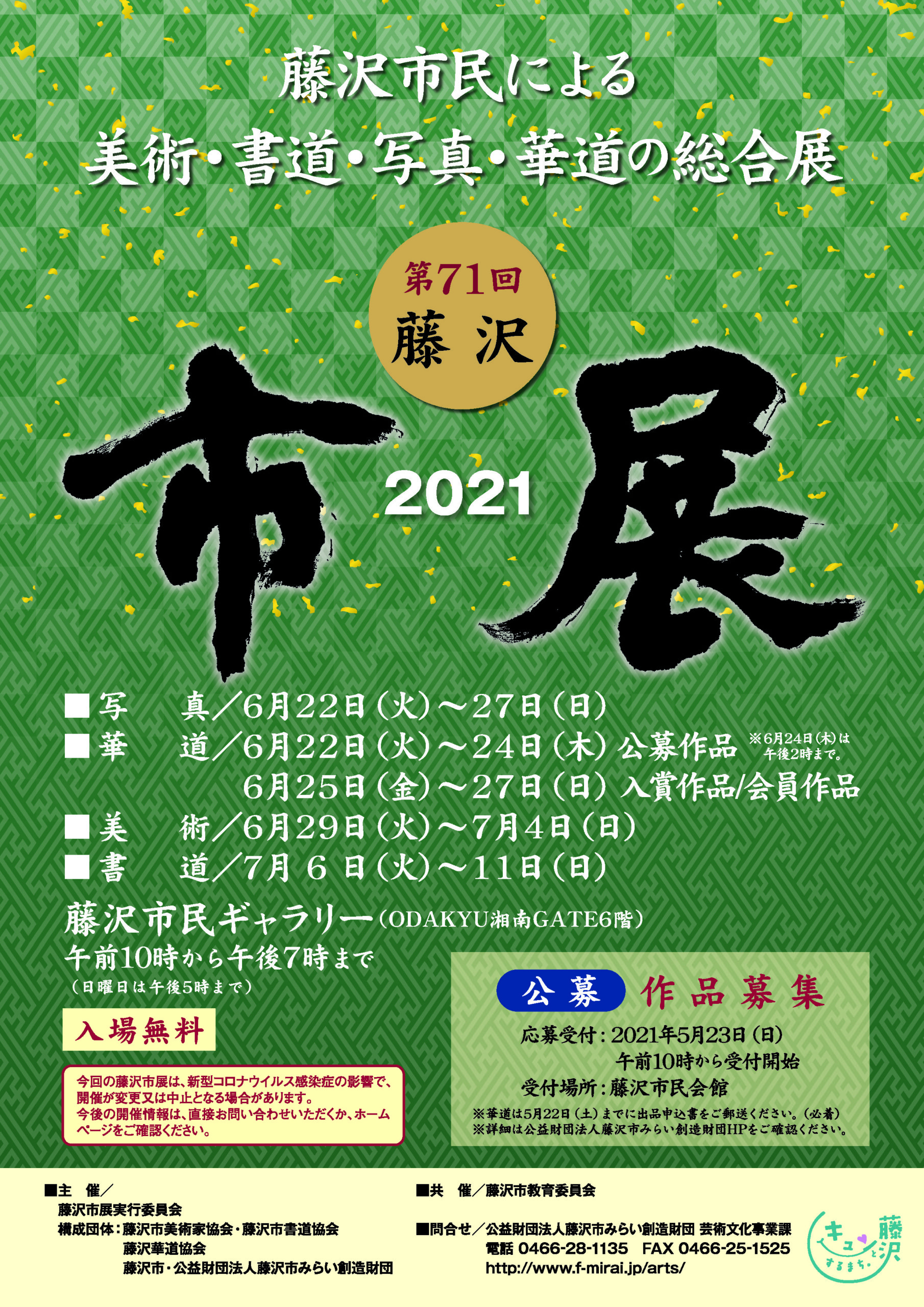 今年も「第71回藤沢市展」を開催するにあたり美術・書道・写真・華道の各部作品募集を行います。