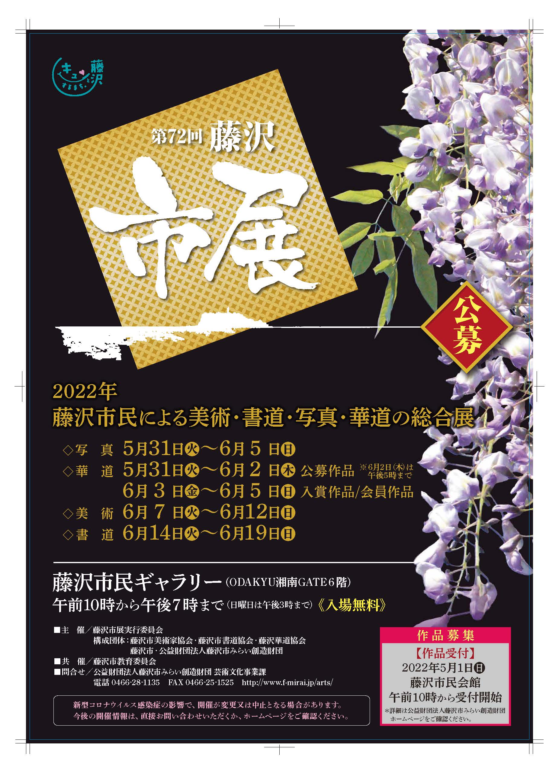 「第72回藤沢市展」を開催するにあたり美術・書道・写真・華道の各部の作品募集を行います。詳しくは下記リンク先より出品規定PDFをご覧ください。たくさんのご応募をお待ちしております。