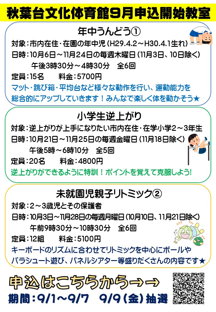 2022年8月26日 / 最終更新日 : 2022年8月26日 akibadai 秋葉台運動施設 【秋葉台文化体育館】9月申込教室のお知らせ 秋葉台文化体育館開催の9月からインターネット受付が始まる教室です! 皆様の申込みをお待ちしております!!! 申込はここをクリック! お問い合わせ:秋葉台文化体育館 📞0466-88-1111 Tweet クリックして印刷 (新しいウィンドウで開きます) 印刷