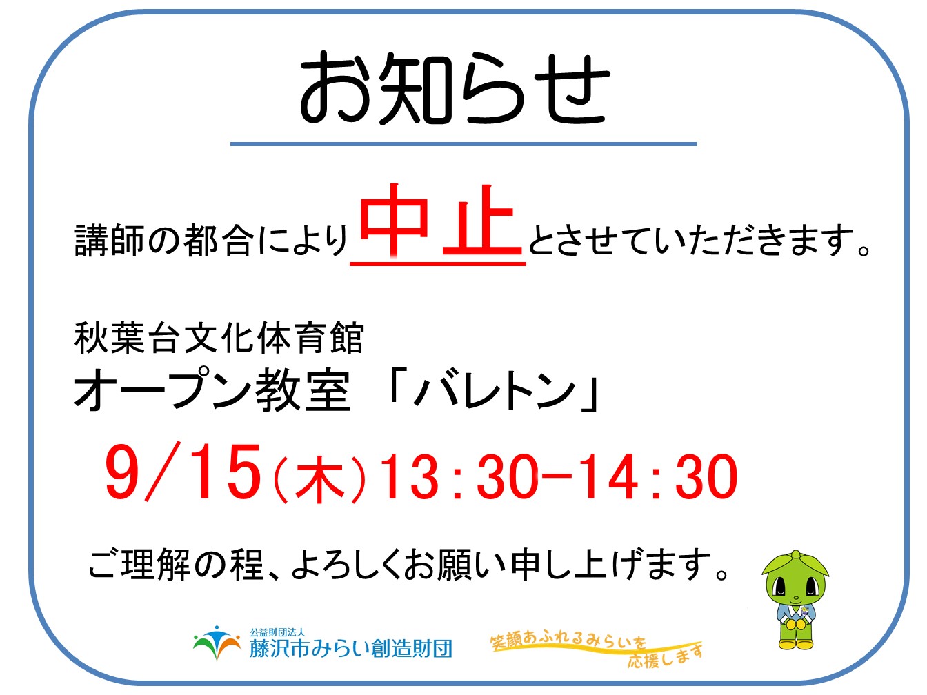 2022年9月6日 / 最終更新日 : 2022年9月6日 akibadai スポーツ事業 秋葉台文化体育館オープン教室「バレトン」中止のお知らせ 日頃より秋葉台文化体育館をご利用いただきましてありがとうございます。 下記、オープン教室は講師の都合により、中止させていただきます。 ご迷惑をおかけいたしますが、ご理解のほどよろしくお願いいたします。 Tweet クリックして印刷 (新しいウィンドウで開きます) 印刷