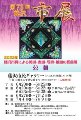 美術・書道・写真・華道の各部の作品の総合展「第73回藤沢市展」を以下のとおり開催いたします。みなさまのお越しを心よりお待ちしております。