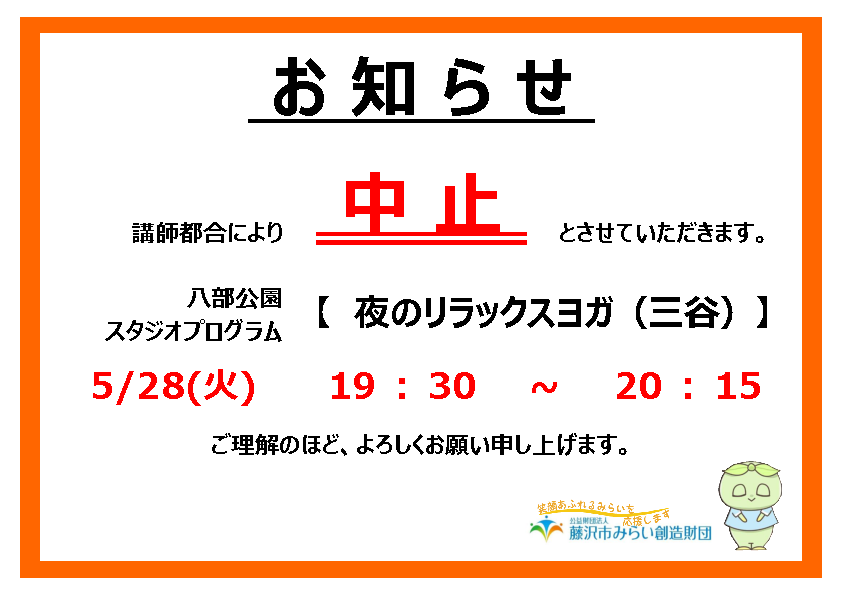 2024年5月28日 / 最終更新日 : 2024年5月28日 kugenuma スポーツ事業 八部公園スタジオプログラム「夜のリラックスヨガ:三谷」中止のお知らせ 日頃より八部公園をご利用いただきましてありがとうございます。 講師の都合により、本日「夜のリラックスヨガ」(講師:三谷) を中止とさせていただきます。 ご迷惑をお掛けいたしますが、ご理解ご協力の程よろしくお願いいたします。 Tweet クリックして印刷 (新しいウィンドウで開きます) 印刷