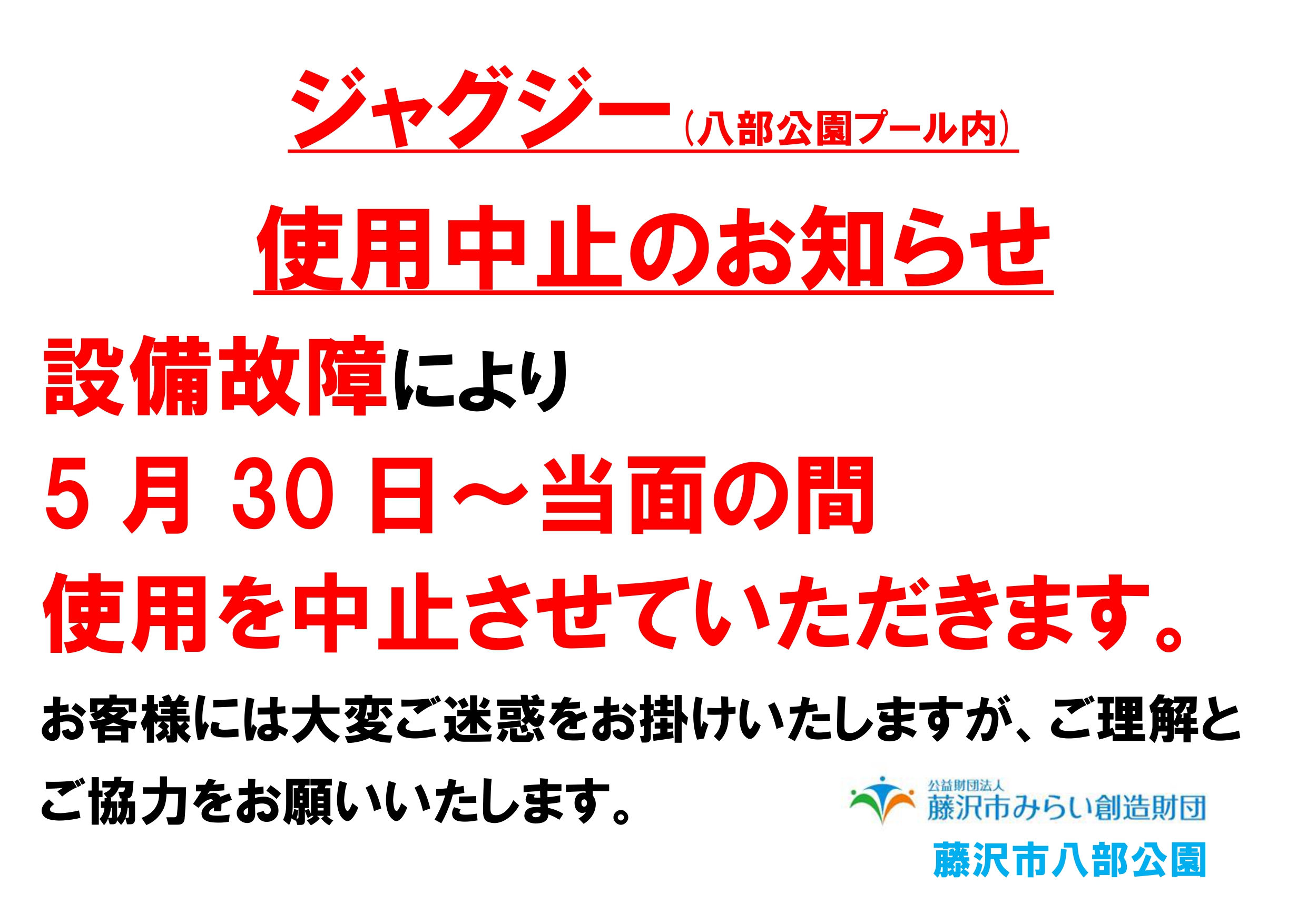 2024年5月30日 / 最終更新日 : 2024年5月30日 kugenuma スポーツ事業 【八部公園プール】「ジャグジー」使用中止のお知らせ 【5/30更新】 日頃より、八部公園プールをご利用いただきましてありがとうございます。 八部公園プール内のジャグジーは設備故障に伴い、当面の間、使用を中止させていただきます。 ご迷惑をお掛けいたしますが、ご理解ご協力のほど、よろしくお願いいたします。 再開については、復旧の目途がたち次第お知らせいたします。 Tweet クリックして印刷 (新しいウィンドウで開きます) 印刷