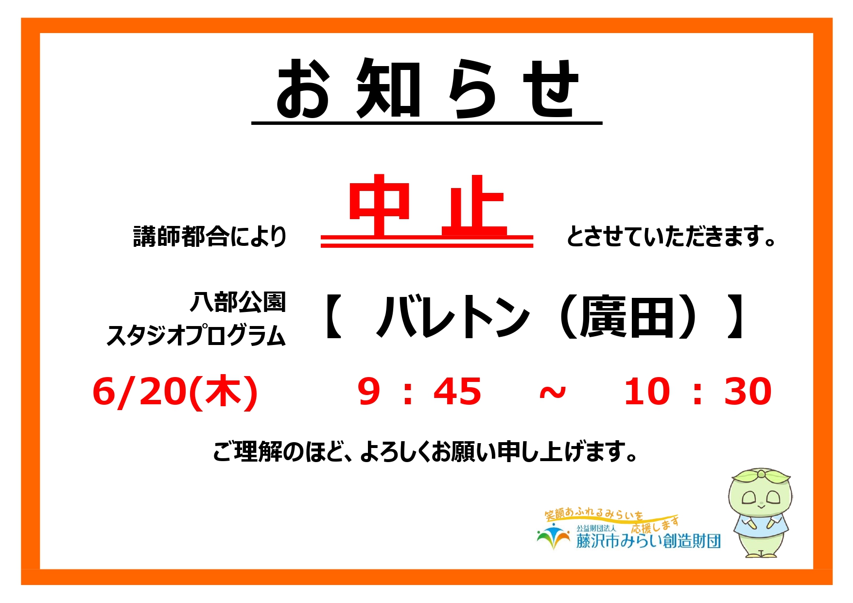 2024年6月11日 / 最終更新日 : 2024年6月11日 kugenuma スポーツ事業 八部公園スタジオプログラム6/20(木)「バレトン」中止のお知らせ 日頃より八部公園をご利用いただきましてありがとうございます。 講師の都合により、6/20(木)「バレトン」(講師:廣田) を中止とさせていただきます。 ご迷惑をお掛けいたしますが、ご理解ご協力の程よろしくお願いいたします。 Tweet クリックして印刷 (新しいウィンドウで開きます) 印刷
