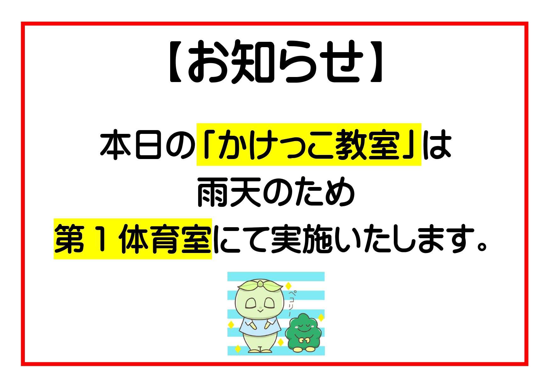 2024/06/28 スポーツ事業秋葉台公園 秋葉台文化体育館「かけっこ教室」会場変更のお知らせ 日頃より秋葉台文化体育館をご利用いただきましてありがとうございます。 下記、かけっこ教室は雨天のため会場を「第1体育室」へ変更させていただきます。 「室内用運動シューズ」をお忘れないようお持ちください。ご来館をお待ちしております。 カテゴリ スポーツ事業秋葉台公園 前へ 【秋葉台文化体育館】7/16(火)から7/17(水)まで女子サウナ・浴室 休室のお知らせ 次へ ハッペニア ~プールのおしごと体験会~ より良いウェブサイトにするためにみなさまのご意見をお聞かせください 質問:このページの内容は参考になりましたか? 参考になったふつう参考にならなかった 質問:このページの内容はわかりやすかったですか? わかりやすかったふつうわかりにくかった 質問:このページは見つけやすかったですか? 見つけやすかったふつう見つけにくかった