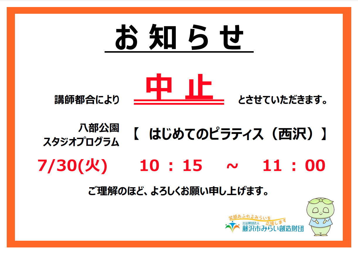 2024年7月14日 / 最終更新日 : 2024年7月23日 kugenuma スポーツ事業 八部公園スタジオプログラム「はじめてのピラティス:西沢」中止のお知らせ 日頃より八部公園をご利用いただきましてありがとうございます。 講師の都合により、7/30(火)「はじめてのピラティス」(講師:西沢) を中止とさせていただきます。 ご迷惑をお掛けいたしますが、ご理解ご協力の程よろしくお願いいたします。 Tweet クリックして印刷 (新しいウィンドウで開きます) 印刷
