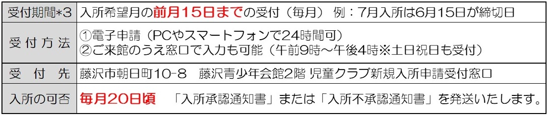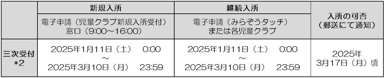 *2 三次受付の方は二次選考終了後、定員(受入可能人数)に空きがある児童クラブのみ、