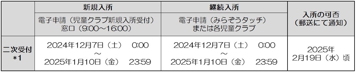 *1 二次受付の方は一次選考終了後、定員(受入可能人数)に空きがある児童クラブのみ