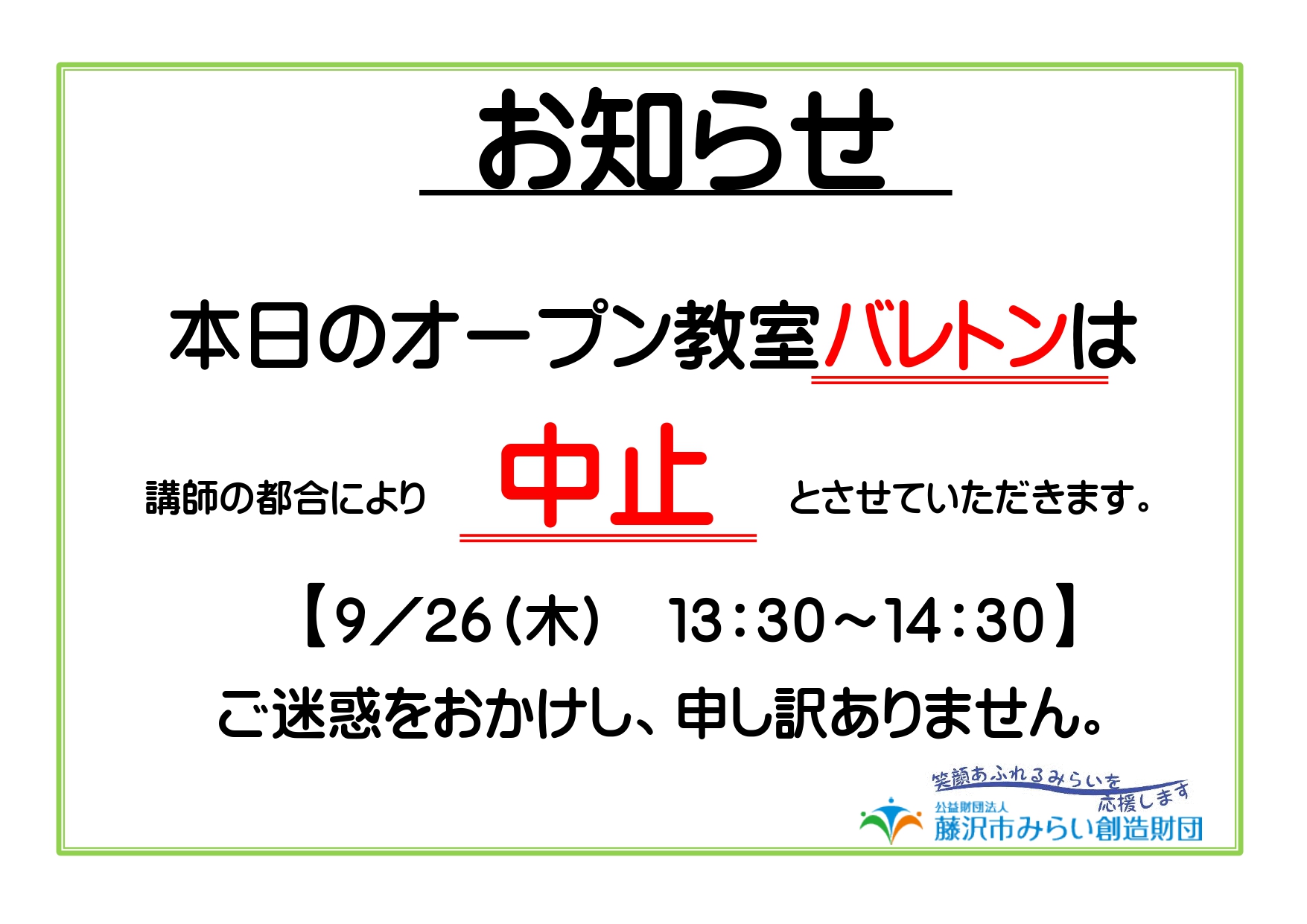 下記、オープン教室は講師都合のため、中止とさせていただきます。