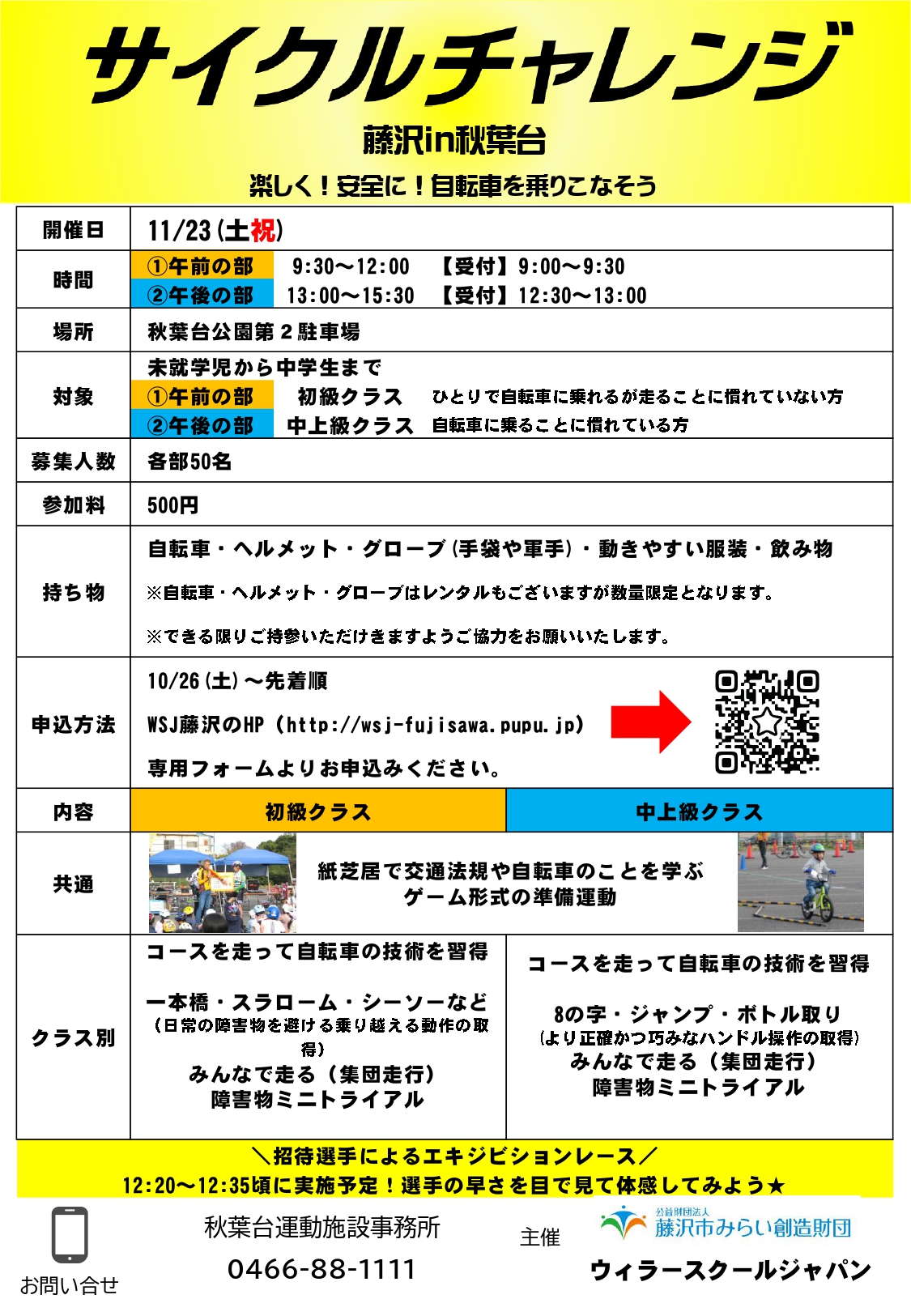 - 雨天中止。前日11/22(金)18時までにWSJ藤沢のホームページで案内します