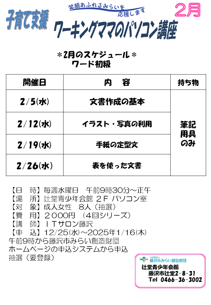 辻堂青少年会館「ワーキングママのパソコン講座 2月 (全4回) 」
