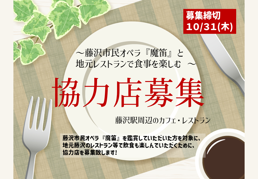 藤沢市民オペラ『魔笛』を鑑賞していただいた方を対象に、地元藤沢のレストラン等で飲食も楽しんでいただくために、協力店を募集致します!