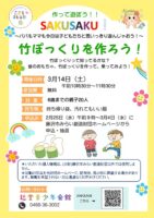 2023年6月9日 / 最終更新日 : 2023年6月9日 辻堂青少年会館 熊谷 イベントお知らせ 辻堂青少年会館「作って遊ぼう!Saku Saku」7月開催のお知らせ 日時 7月8日(土) 午前10時~11時30分 内容 竹でテント作り 場所 辻堂青少年会館 対象 6歳までの親子 5組 費用 無料 申込み 6月10日(土)~6月20日(火) 藤沢市みらい創造財団ホームページの申込システ […]