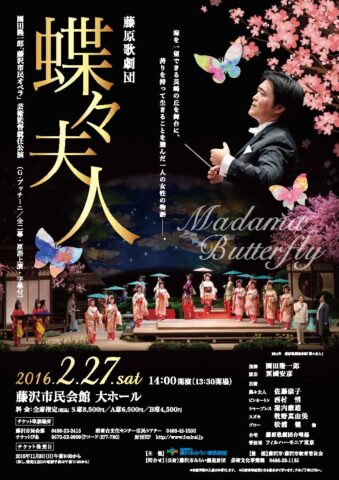 蝶々夫人(2015年) 園田 隆一郎「藤沢市民オペラ」芸術監督就任公演 藤原歌劇団招聘公演 開催日 2016年2月27日(日) 出演者 指揮:園田 隆一郎 演出:粟國 安彦 蝶々夫人 佐藤 康子 ピンカートン 西村 悟 シャープレス 堀内 康雄 スズキ 牧野 真由美 ゴロー 松浦 健 ボンゾ 若林 勉 ヤマドリ 清水 良一 ケイト 吉村 恵 神官 坂本 伸司 主催 公益財団法人藤沢市みらい創造財団 後援 藤沢市・藤沢市教育委員会