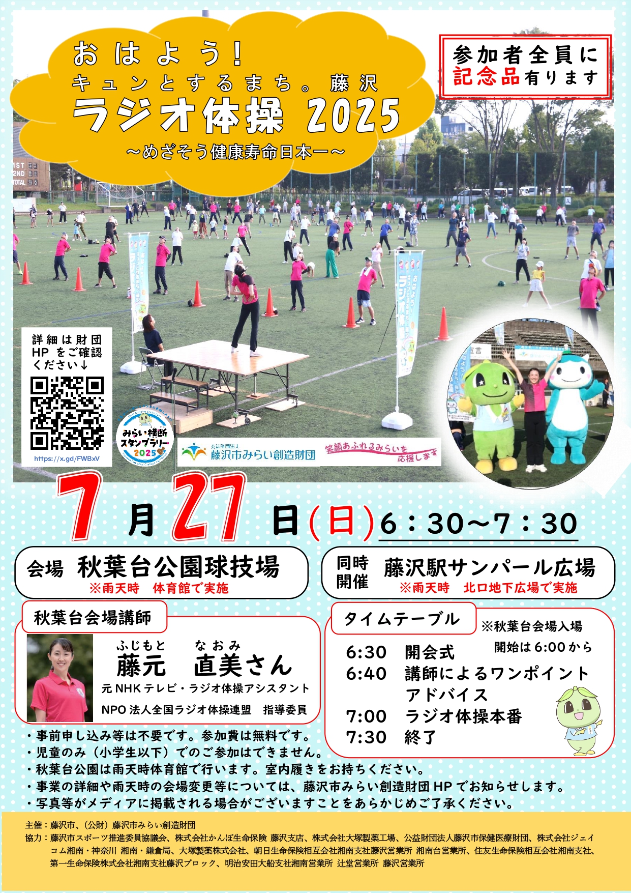 時 間:①秋葉台文化体育館 6:00 会場ゲート開門 6:30 開会式 6:40 講師によるワンポイントレッスン 7:00 ラジオ体操(第1、第2実施) ②藤沢駅前サンパール広場 6:30 開会式 6:40 講師によるワンポイントレッスン 7:00 ラジオ体操(第1,第2実施)協力団体・企業