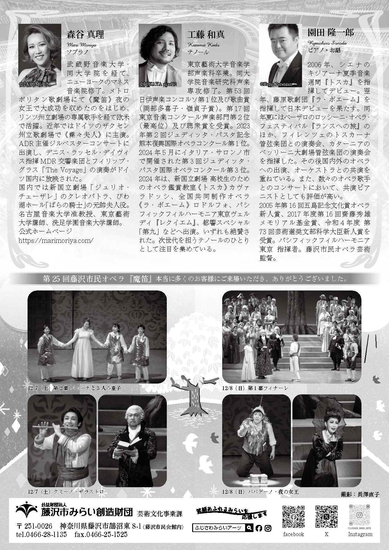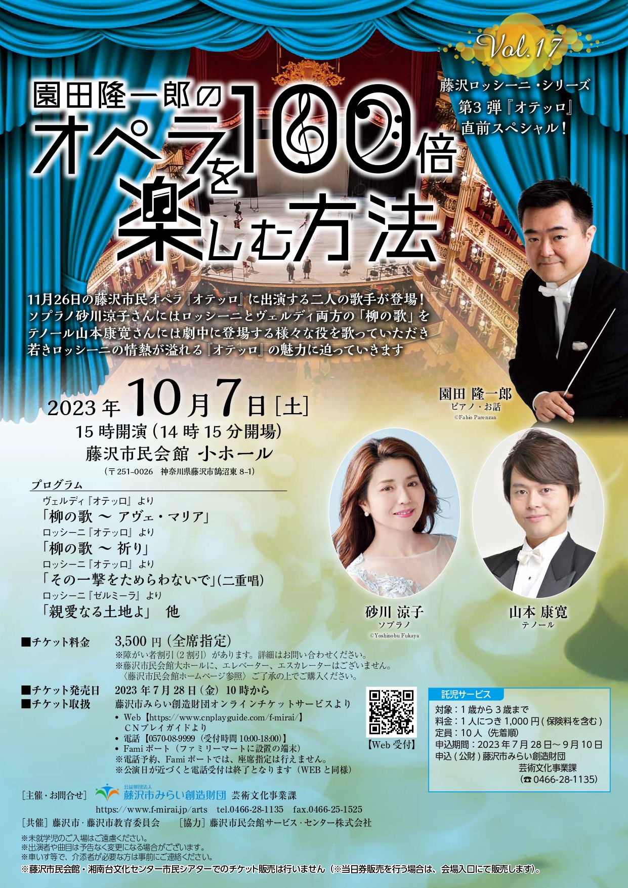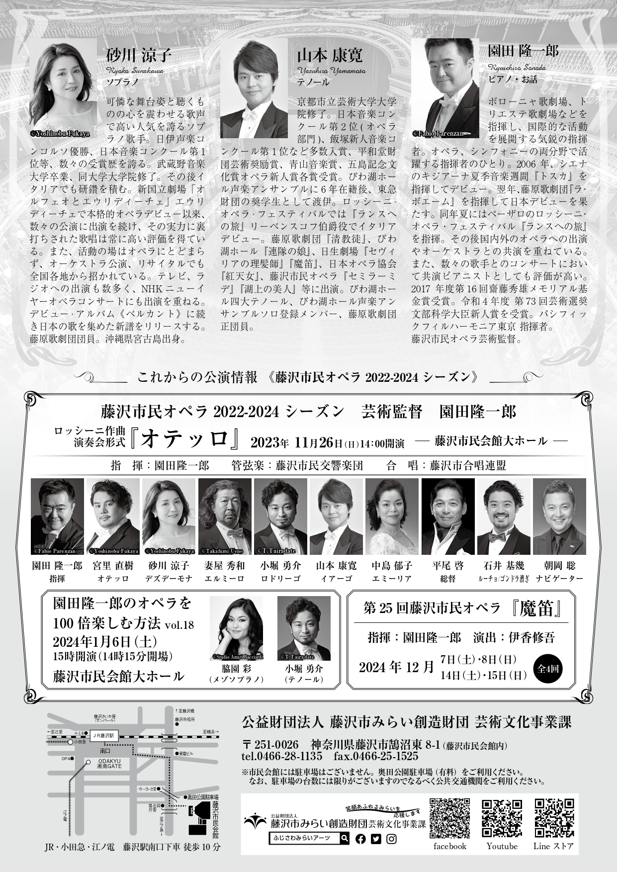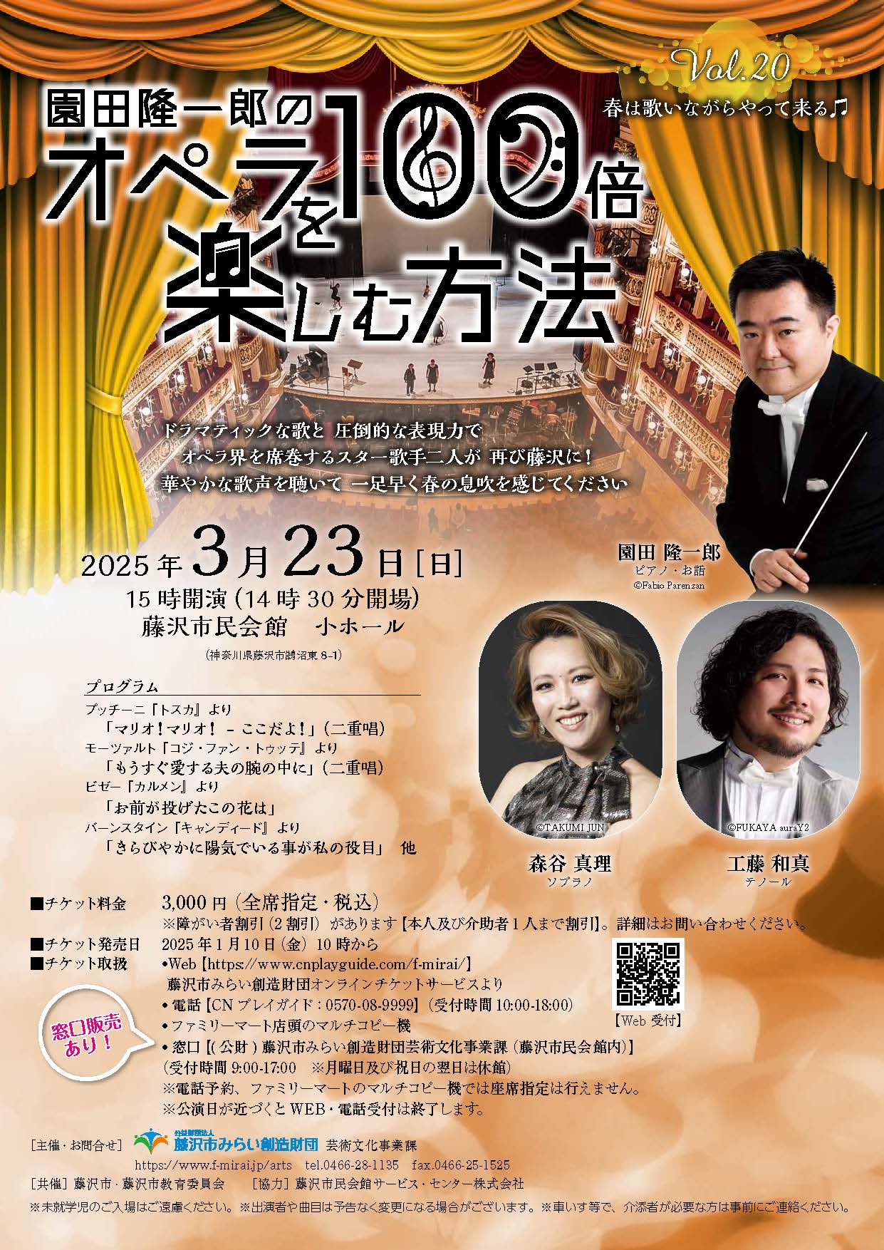 辻堂青少年会館 電話:(36)3002藤沢市民オペラ2022-2024シーズン芸術監督で指揮者の園田隆一郎が、オペラ界大注目の歌手とともに、美しい歌声と楽しいトークをお届けする人気シリーズ第20弾!! ドラマティックな歌と 圧倒的な表現力で オペラ界を席巻するスター歌手二人が 再び藤沢に! 華やかな歌声を聴いて 一足早く春の息吹を感じてください