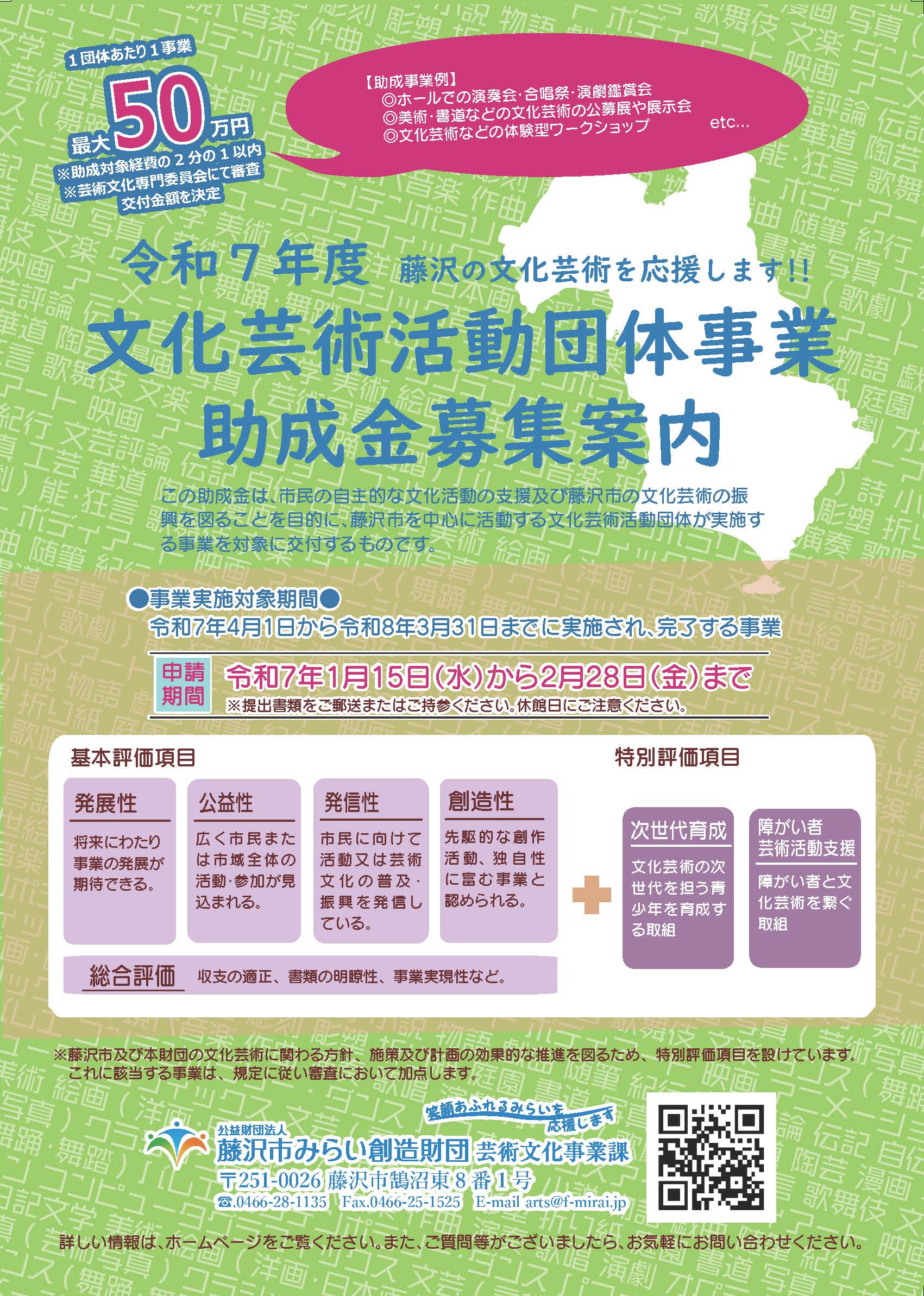 - 助成金の交付決定を受けた事業を実施する際は、作成する各種印刷物、ホームページなどには必ず次の名称を記載、表示してください。万が一、交付の記載がない場合は、助成が取り消される場合があります。 『公益財団法人藤沢市みらい創造財団 文化芸術活動団体事業助成金交付事業』