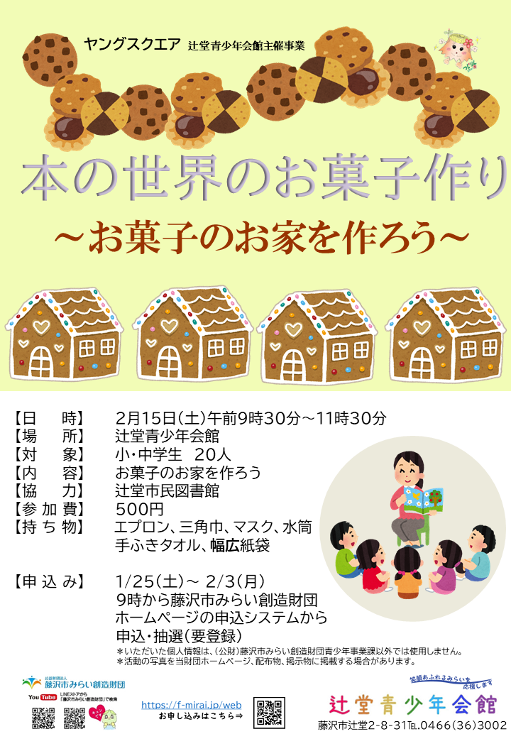 1月25日(土)~2月3日(月)午前9時から藤沢市みらい創造財団ホームページの申込システムから申込・抽選(要登録) https://f-mirai.jp/web問い合わせ