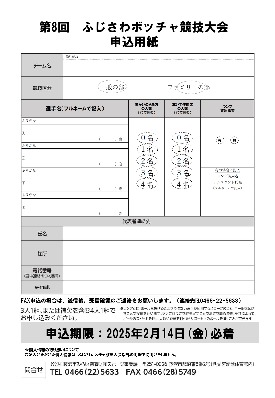 ①一般の部・・・36チーム(どなたでも参加できます。家族、友人、職場の同僚などでお申し込みください。) ②ファミリーの部・・・12チーム(障がいがある方を含む家族でのチーム。年齢制限ございません。家族+友人などでも参加可能) ※1チーム3人制による団体戦、事前申込制(申込多数の場合は藤沢市内のチームが3分の2になるように抽選します)【参加費】