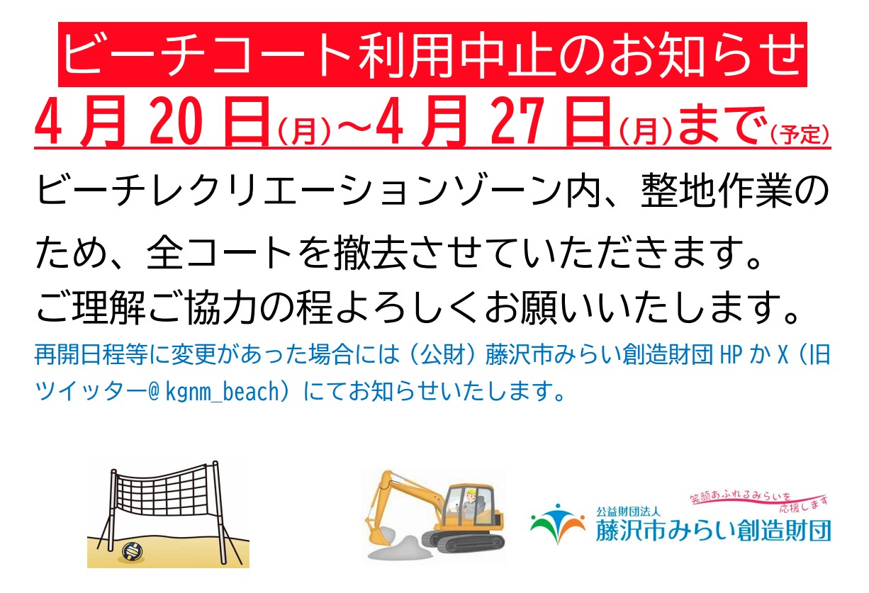 バレーコートは海岸線に設置しているため、台風や高波などの気象状況により、管理運営上、一時的にコートを一部または全面撤去する場合があります。また、一部の大会期間中、一般利用者の貸出しを休止または制限する場合があります。