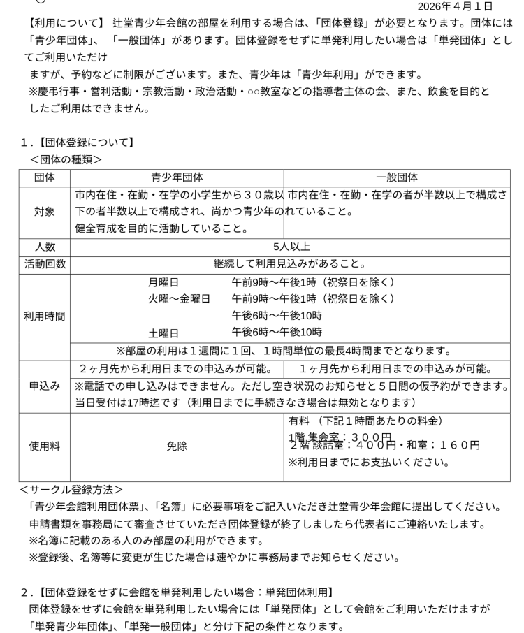 「青少年会館利用団体票」、「名簿」に必要事項をご記入いただき辻堂青少年会館に提出してください。